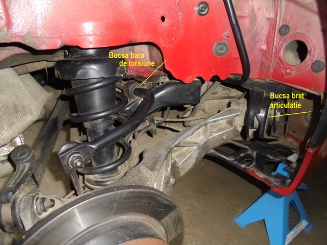 Dupa cum ai vazut, eu nu le-am schimbat, dar eram pregatit de "actiune". Un amic mi-a prelucrat la strung un dorn metalic cu diametrul exact cat este diametrul exteriorl - bucsa din carcasa , iar pe partea frontala este concava astfel incat marginea are 5 mm/ se fixeaza pe marginea bucsei din suport, iar centru ei intra in concavitate. Suportul se aseaza pe un lemn/fag sau stejar cu gaura, asta ca sa nu-l deformezi, apoi se bate cu ciocanul in dorn, dorn care impinge bucsa. Folosesti WD 40 pentru degripare. Daca ai o presa hidrulica/ sau cu surub este super :) Un suport cu bucsa costa 320 lei X 2 buc=640 lei. O bucsa este 38 lei, merita incercata una din variante. 8-)...parerea mea.
