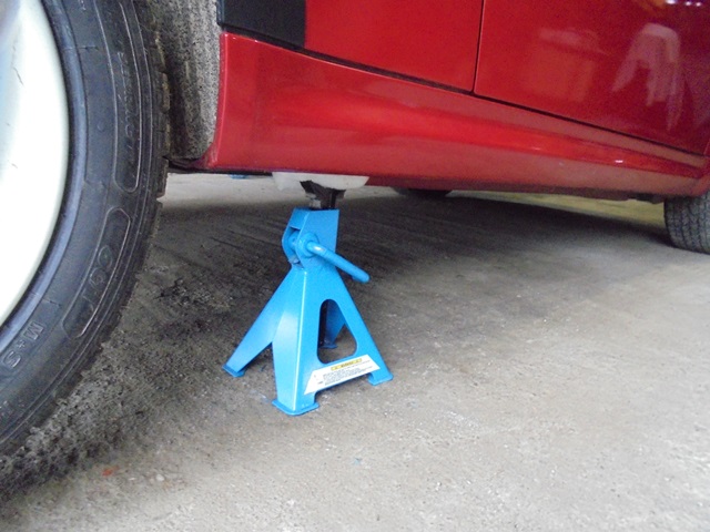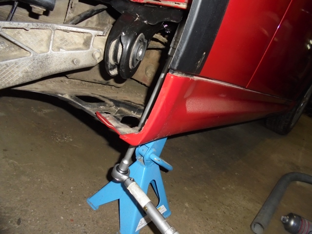 -suspendarea caroserie pe suport si montarea cricului sub brat in punctul de legatura cu partea inferioara a amortizorului pentru a mentine suspensia comprimata, apox. 30-40mm (foto 1);