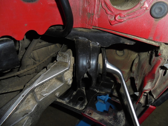 -se demonteaza surubul axial de prindere brat-suport folosind initial o cheie inelara de 20 pentru “ruperea cuplului de strangere” , o parghie atasata inelarei este foarte utila (foto 16);