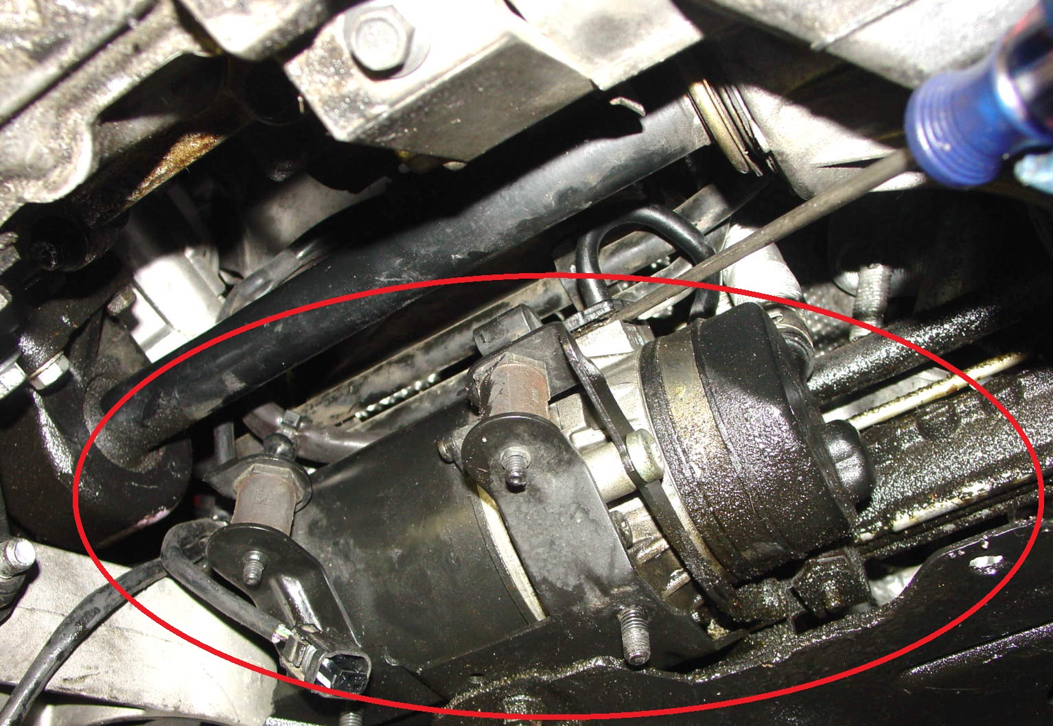 eu zic totusi ca este un fel de bazait ce iti vine de la pompa de directie este tot de acolo (dreapta jos cum ai indicat in poza) dar tre sa ajungi pe dedesubt...destul sa pui un cric pe care te poti baza pe partea stanga (a masinii, partea soferului) si sa iti bagi putin nasul dupa motor (vezi foto) acolo ai sa dai de o chestie cilindrica si cred ca va avea si un ventilator (este in spatele lui)
