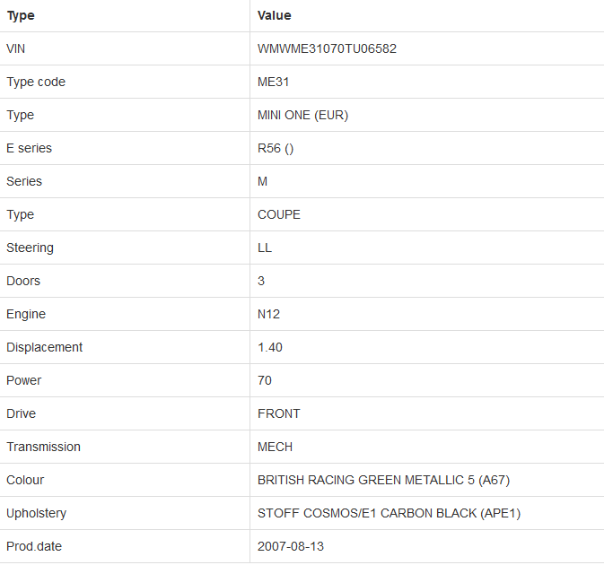 Sun nou pe forum si sunt farte incantat de un Mini ce doresc sa il cumpar dar poate prea incantat, de aceea ro daca se poate verifica cat de ok ar fi masinuta dupa seria ei, rog sa ma ajute si pe mine cineva, seria: WMEME31070TU06582.