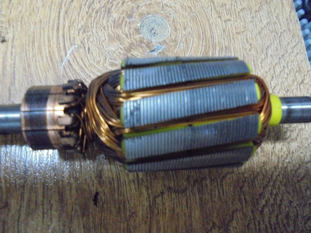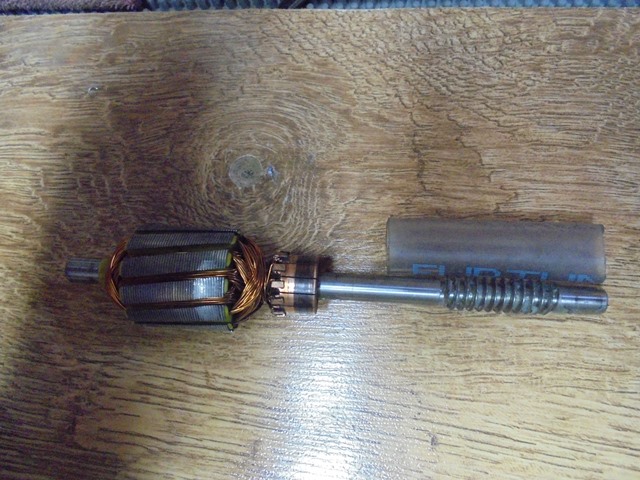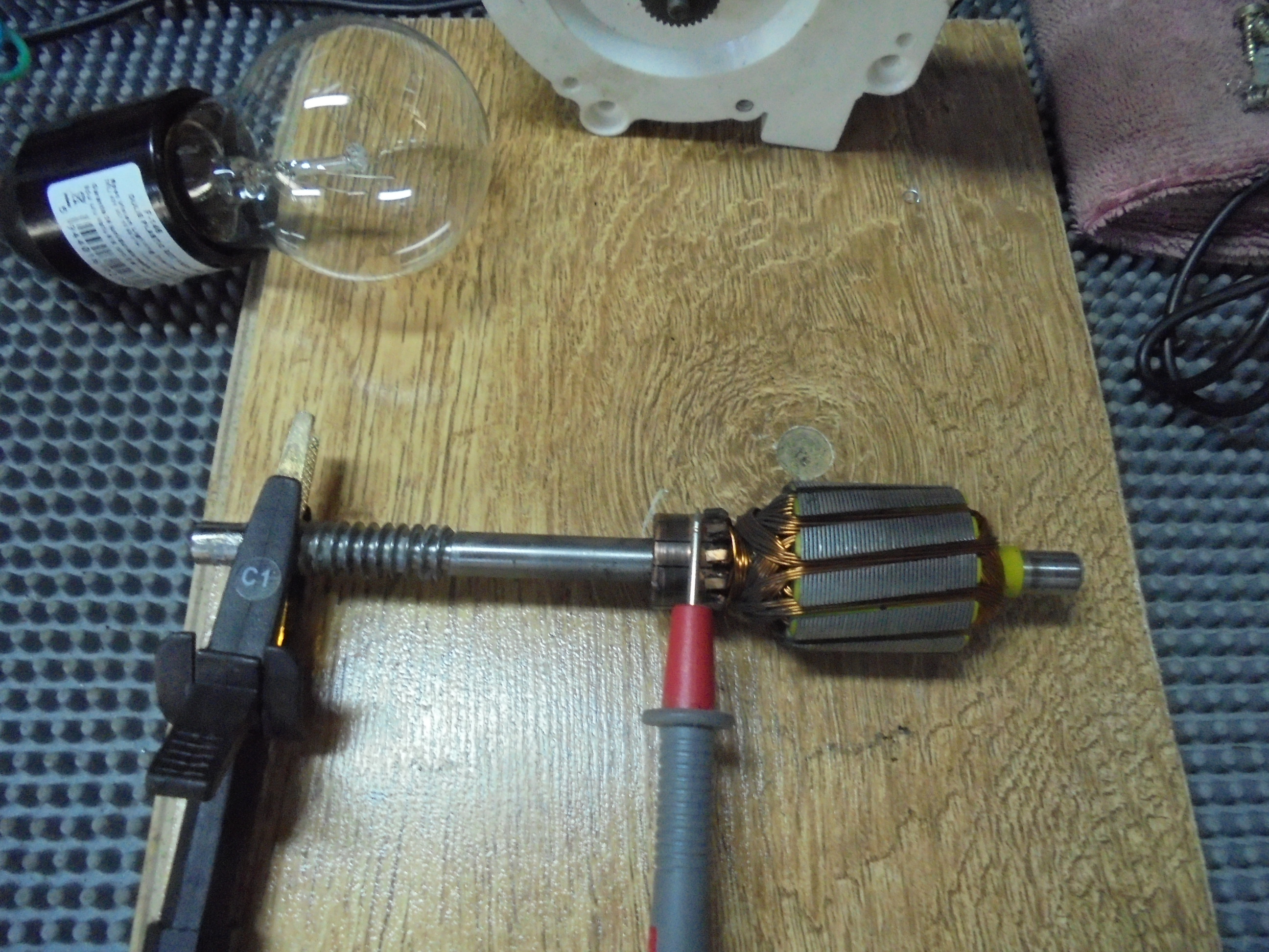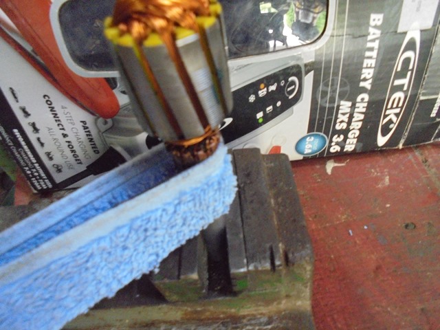 8.Curatarea colectorului_in timpul functionarii motoarelor de c.c, colectorul se uzeaza(santuri pe colector), iar canalele separatoare dintre lamele se incarca cu praf de grafit, ceea ce conduce la inrautatirea comutatiei, aparitia scanteilor la colector si pierdere de putere. Acesta este un motor de putere mica si singura intretinere este curatarea colectorului cu o panza/carpa mai abraziva( prosop uzat si bine uscat). Nu se curata cu HARTIE ABRAZIVA!! deoarece apar santuri fine care uzeaza rapid periile colectoare si rezulta depuneri de grafit in circuitul rotoric( cale de conductivitate si pierderi electrice!). Se introduce axul intr-o bucata de furtun pentru protejare la strangere(foto 11), apoi se prinde intr-o menghina avnd colectorul la partea superioara. Se roteste bucata de prosop pe colector pana cand se obtine o suprafata curata( foto 12, foto 13). Cu o surubelmita lata ascutita se curata canalele colectorului de praf de carbune printr-o singura tragere dispre colector catre ax( aveti grija sa nu zgariati colectorul!)_foto 14.