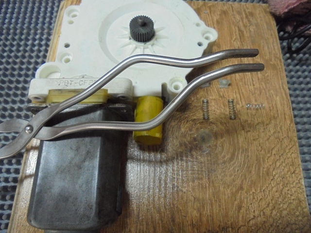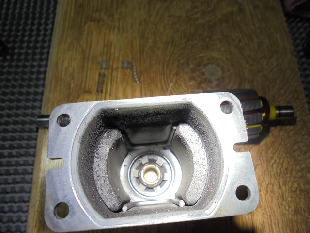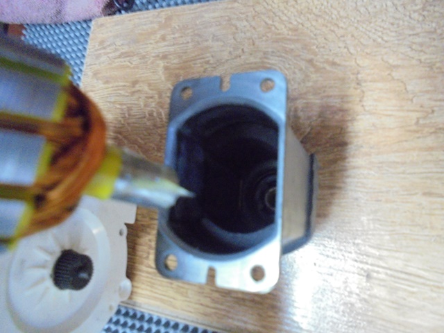 14.Se introduce kit-ul rotor-stator cu axul mec in mecanism, dar nu se preseza pe carcasa, practic se pastreaza o distanta de 6-7 mm pentru fixarea arcurilor si capacelor PVC pentru blocarea periilor. Atentie_cand se introduce rotorul, periile trebuie deplasate in exterior in locas, astfel incat sa intre in contact cu colectorul, si apoi se introduc cele doua arcuri! Lucrati cu rabdare si grija sa nu deteriorati arcurile sau capacele... nu sunt piese de schimb si nu se gasesc in comert