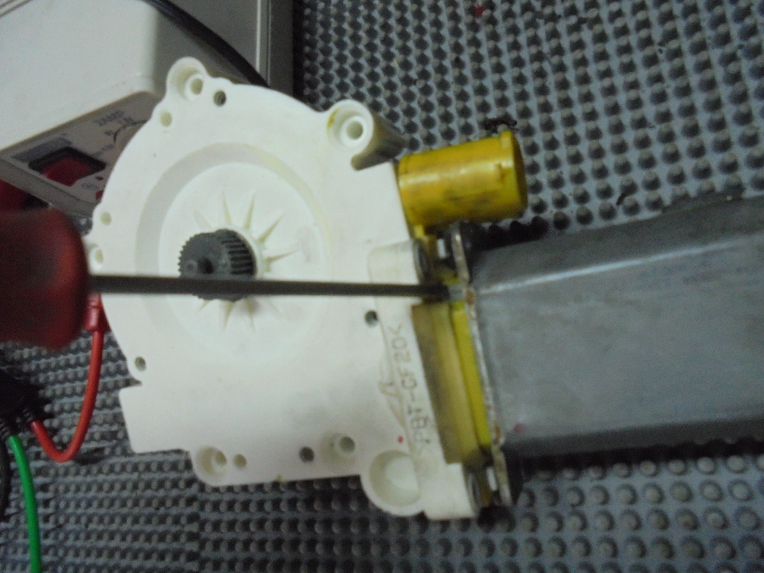 2. Demontarea/separare motorului fata de angrenaj_se foloseste un imbus de 3mm cu ajutorul caruia se desurubeza cele 4 suruburi( foto 2). Dupa desurubare se trage axial maximum 5 mm de motor in partea dreapta, tinand cu mana stanga angrenajul mecanic. Apoi cu o surubelmita de dimensiune mica se scot cele doua capace de PVC protectoare ale locasurilor de culisare pentru perilor colectoare si arcurilor de presiune. Lucrati cu gija sa nu distrugeti capacele sau sa pierdeti arcurile care sunt comprimate! (foto 3 si foto 4)