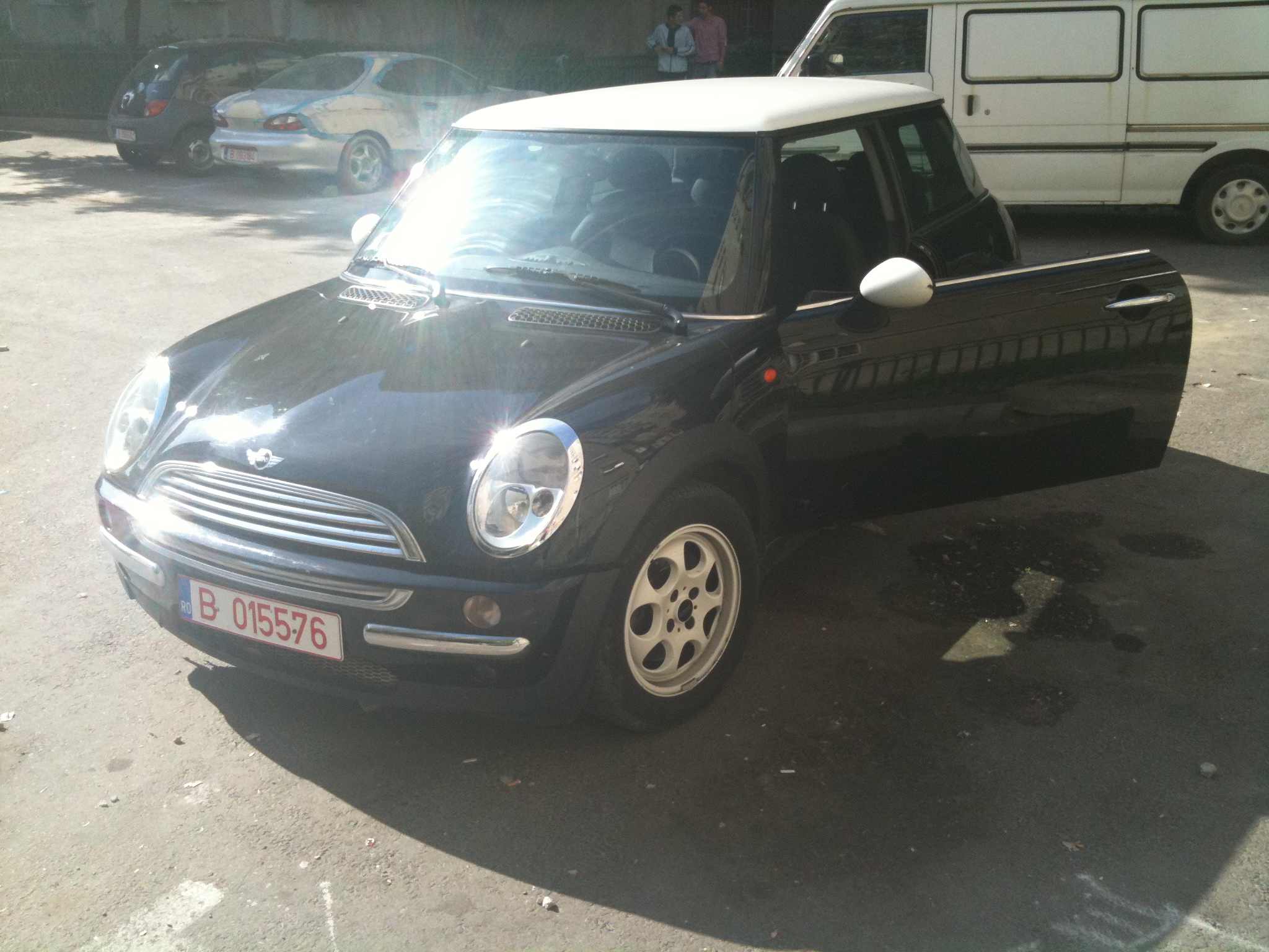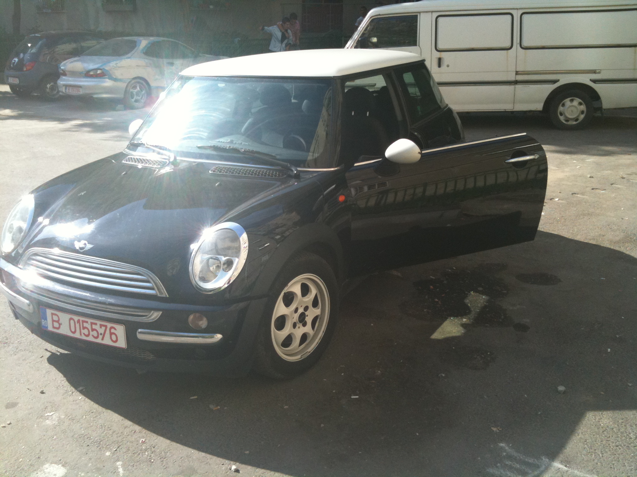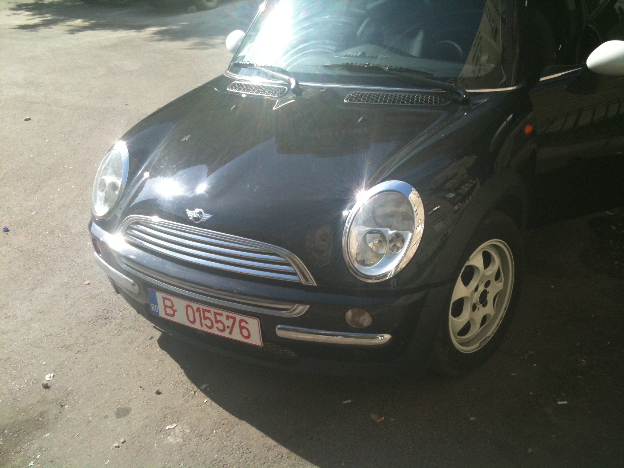 Nume inca nu are,inca ma mai gandesc,poate dupa ce o inmatriculez o sa ii pun si un nume :D MY MINI e negru cu plafon alb,cutie automata,jante 15"( :( ),toba cred ca este modificata de fostul proprietar :twisted: .Oops!am uitat sa precizez:este un MINI COOPER R50 din 2002 :mrgreen: de aici...las pozele sa vorbeasca :lol: